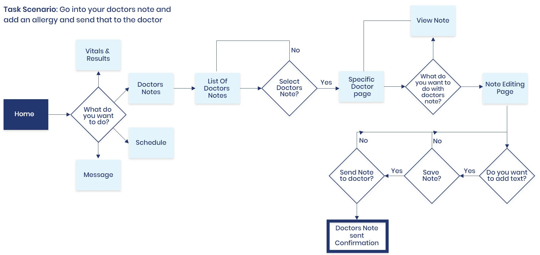 I learned that my users were struggling with some of the button labels, so I went back and revised the sitemap to rename a few of the buttons for clarity. Users were confused with what “Progress” was referring to so “Progress” was changed to “Vitals & Results”. The “Message” button was kept, but a “Doctors’ Notes” button was added so patients could easily find the doctor’s note.